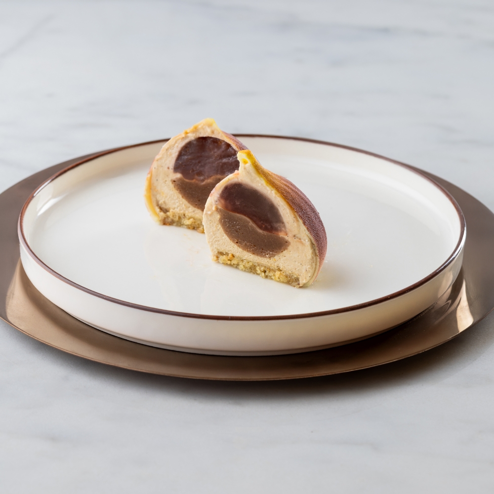 Silky chocolate mousse with a caramel heart on a crisp tart base, crowned with gold.