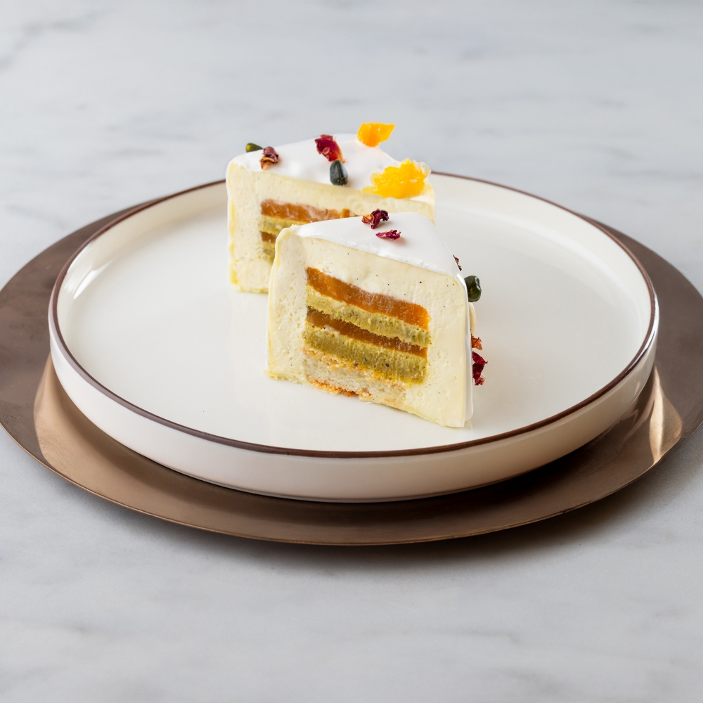 Soft almond cream and sponge cake covered in a Turkish delight shell with pistachio, almond, apricot, and rose petals.