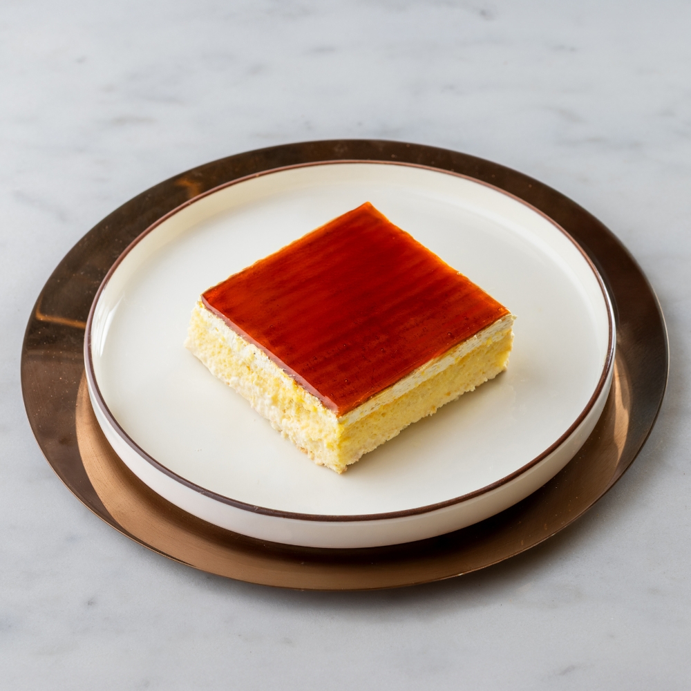 A soft three-milk sponge finished with a smooth caramel topping. Light, creamy and elegantly sweet.