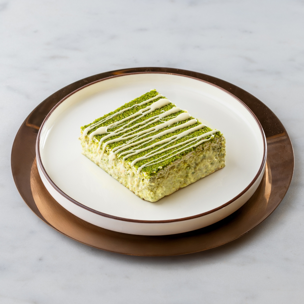 A soft three-milk sponge infused with premium pistachios, topped with a velvety pistachio cream. Light, nutty and elegantly sweet.