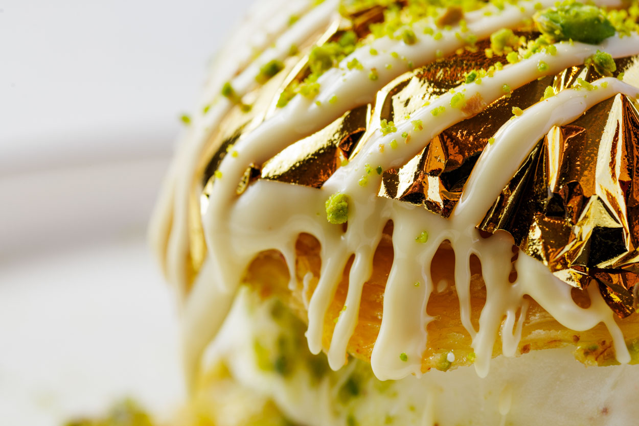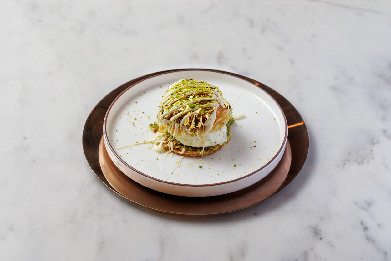 Signature round pistachio baklava layered with Turkish ice cream and luxurious Dubai style pistachio kadayif cream, finished with an elegant layer of edible 24K gold.