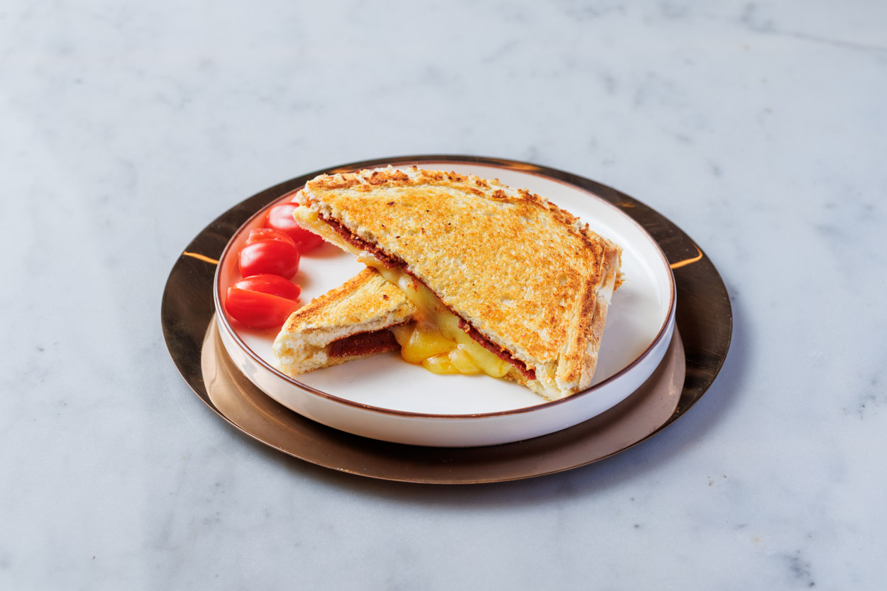 Grilled Turkish toast made with crispy, in-house baked bread, filled with melted cheese, Turkish beef sucuk and a touch of tomato paste, served warm.