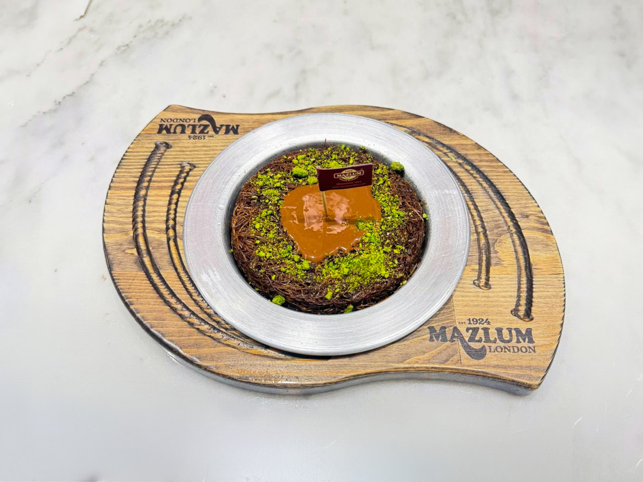 Golden shredded kadayif with melted cheese and syrup, finished with Mazlum’s signature pistachio sauce. A large sharing portion perfect for 4–5 people. (Can be served with Turkish ice cream upon request).